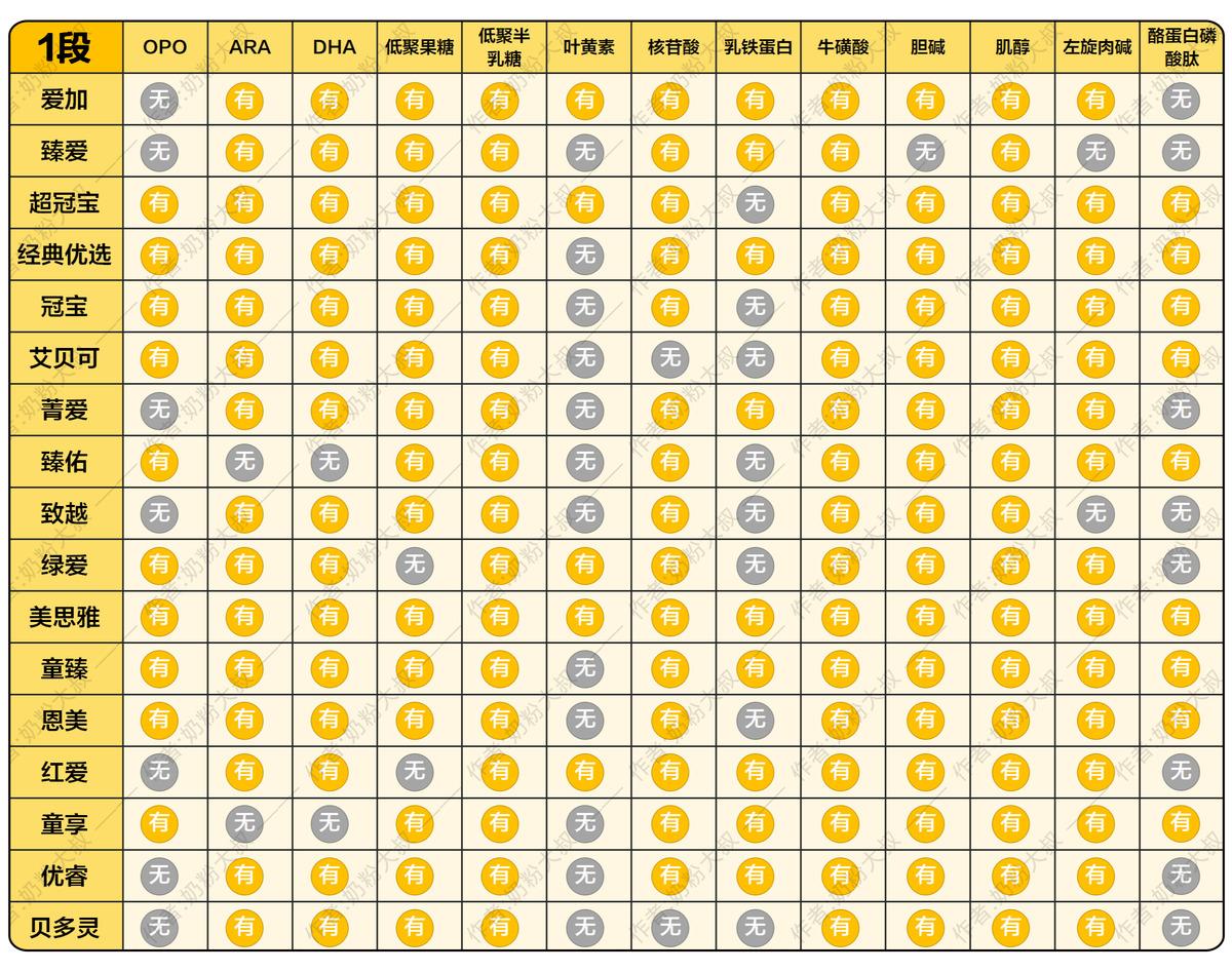 全部17个系列的1段奶粉都添加了低聚半乳糖,牛磺酸和肌醇,其他的营养成分添加情况各有不同,汇总如下: