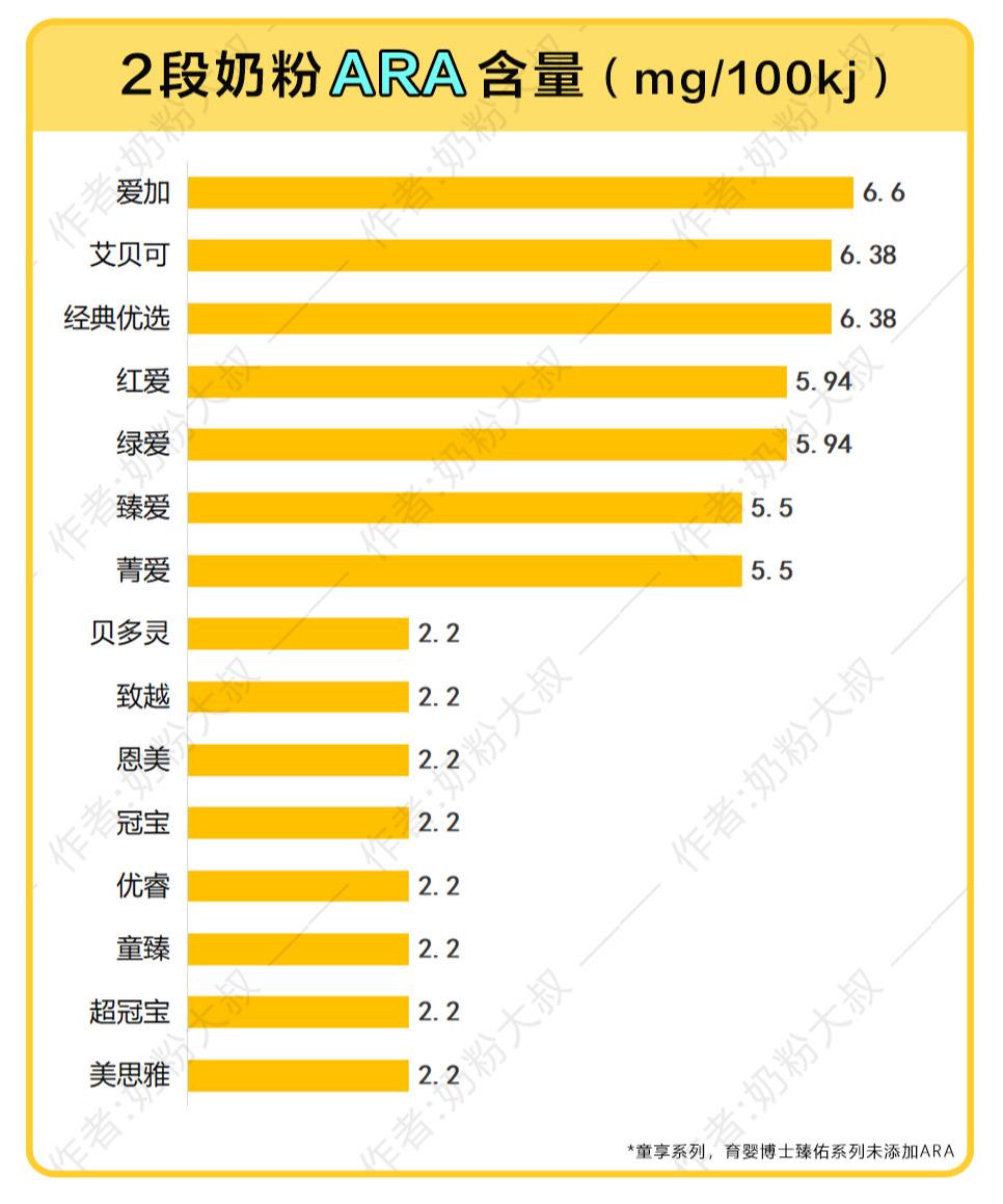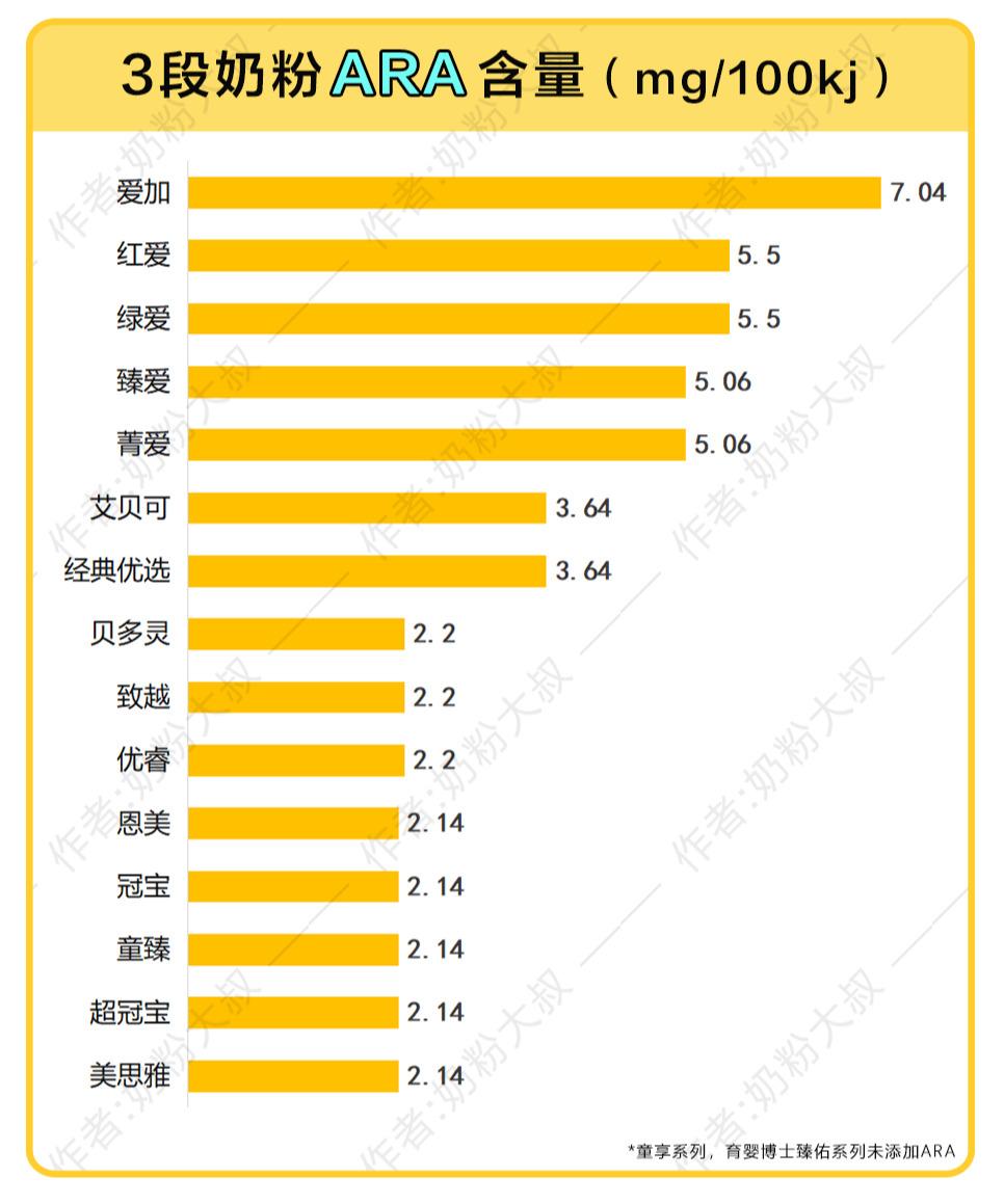 目前市面上超过90%的奶粉都添加了DHA,大部分添加了DHA的配方奶粉都会有ARA。这17个系列3段奶粉中,除了童享3段育婴博士臻佑3段并未添加DHA和ARA,其他系列均添加了,含量也差不多,只有爱加3段DHA含量在市售多数奶粉中排名中上位置,具体含量如下: